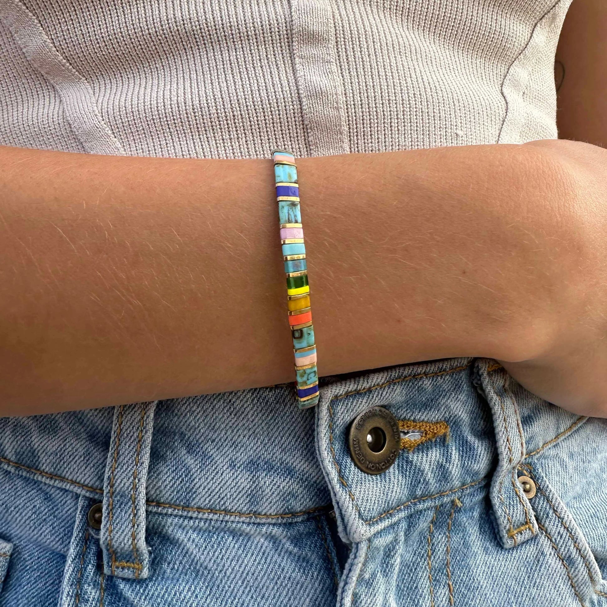 Discover the Chic Charm of our Aloha Flat Bead Bracelet! A captivating addition to your daily attire, the Aloha Bracelet features a delightful blend of rainbow and turquoise beads, making it a must-have addition to your accessory collection.