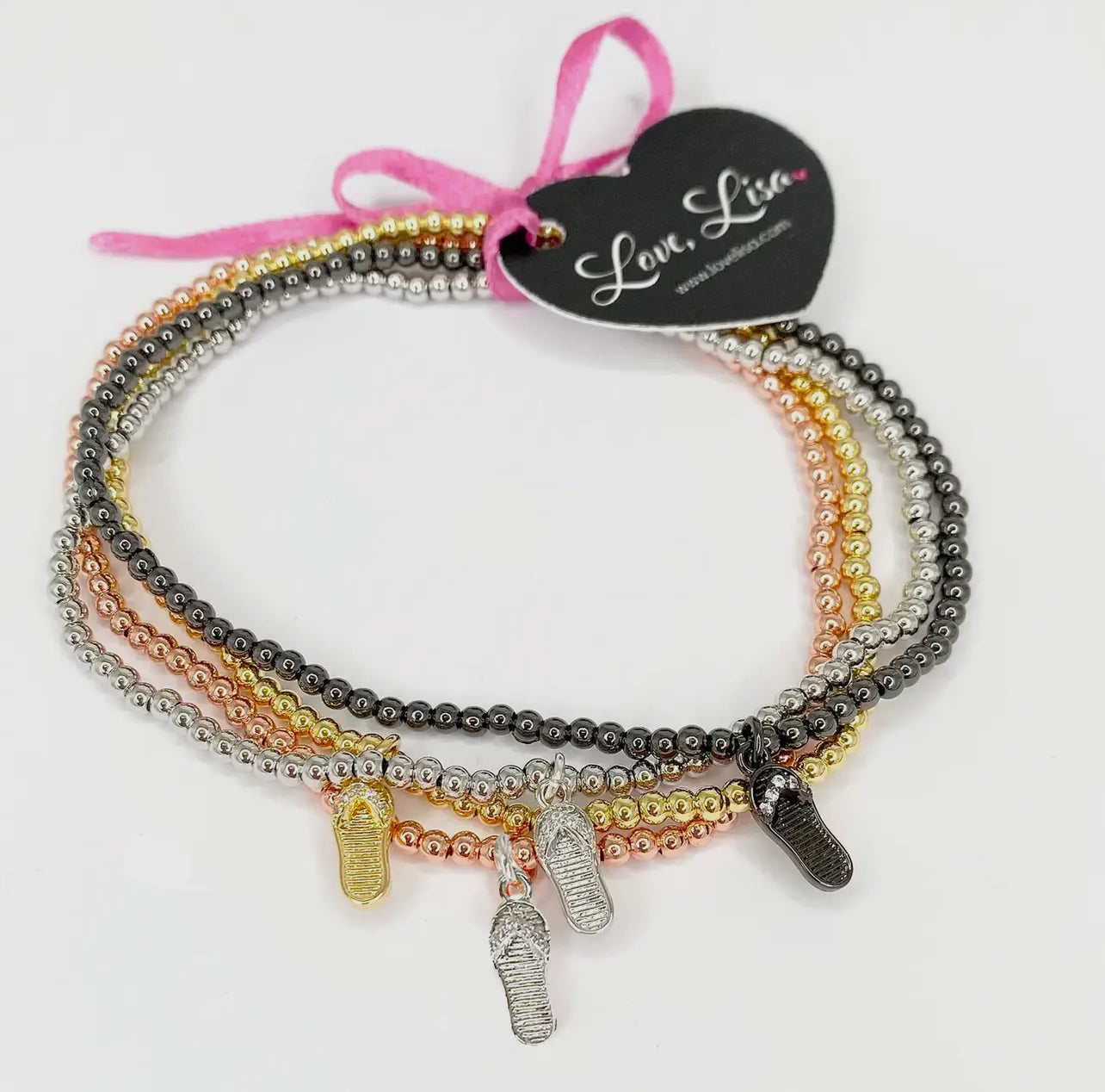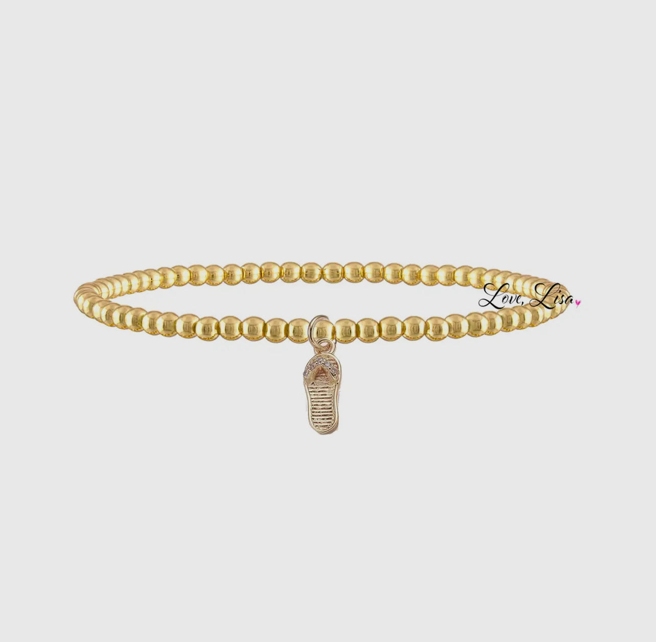 A cute reminder of the summertime! Feet in the sand, warm weather and flip flops. This sturdy 3mm metal beaded bracelet has a sweet little flip flop charm hanging down.
