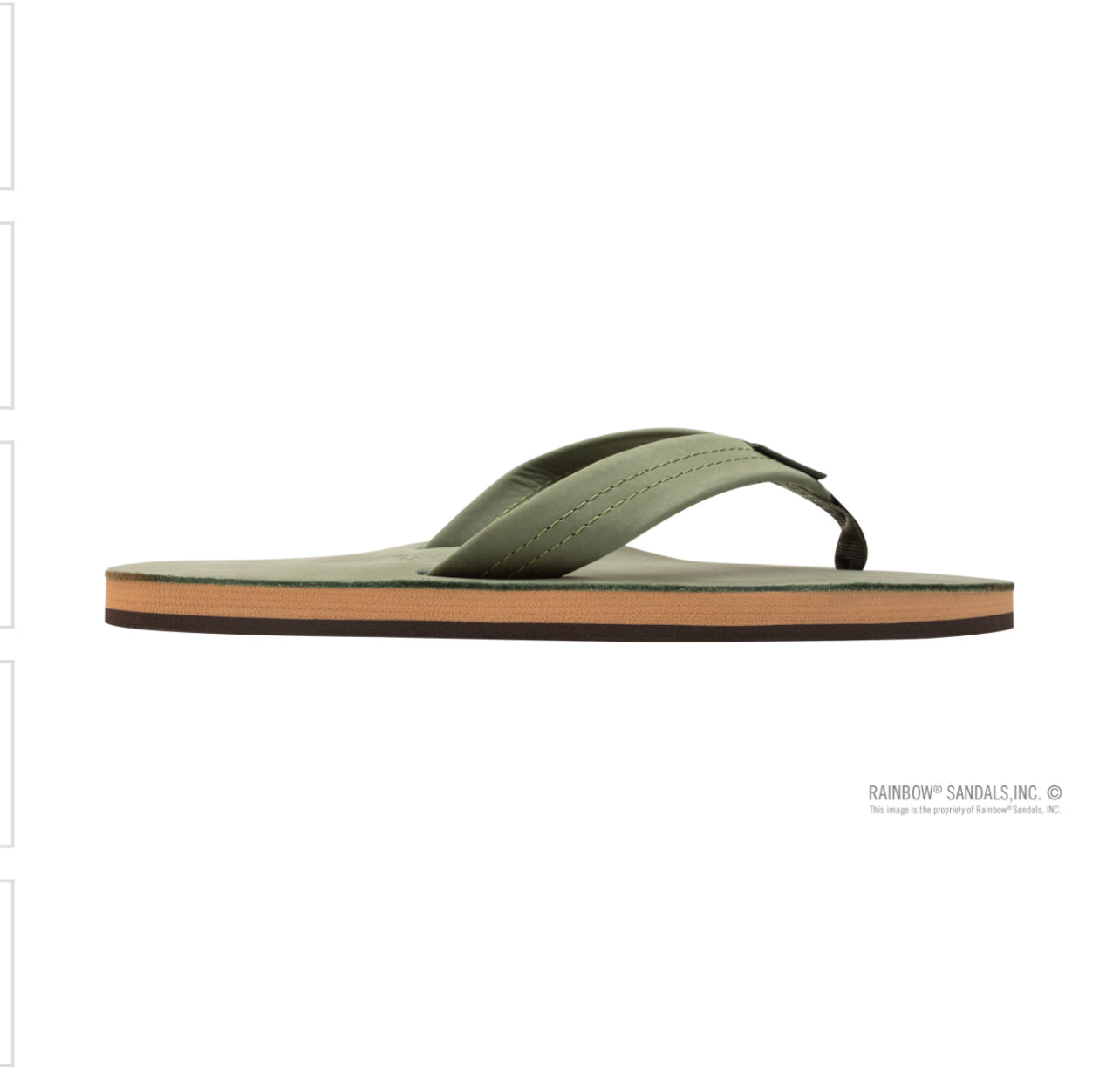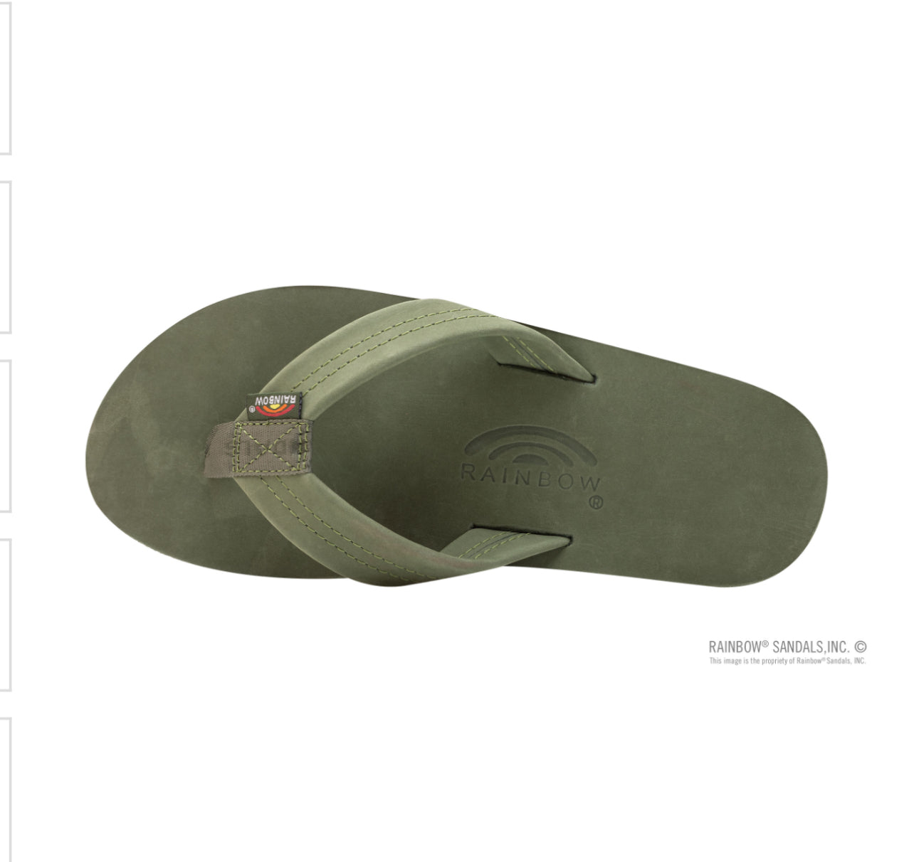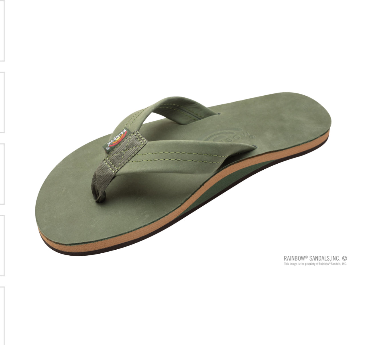 The single layer premier leather sandal is made with top grade nubuck leather; the top sole is embossed with the Rainbow® logo. The strap, also nubuck leather; is double stitched, and the nylon toe piece is secured with a box X stitch, all using bonded nylon thread.
