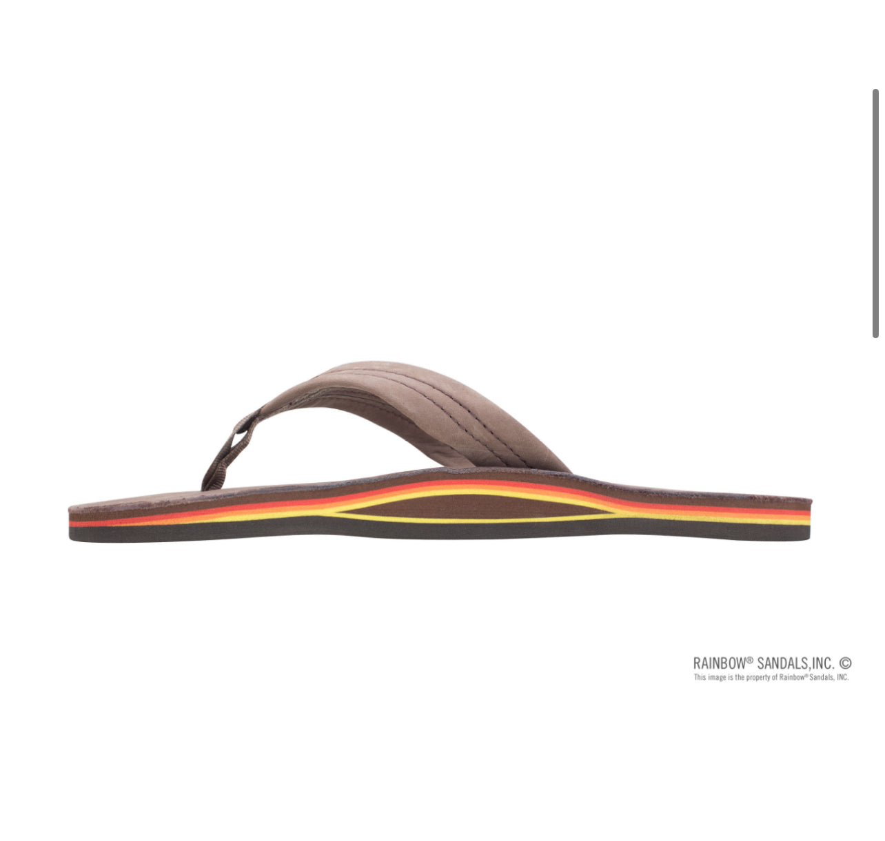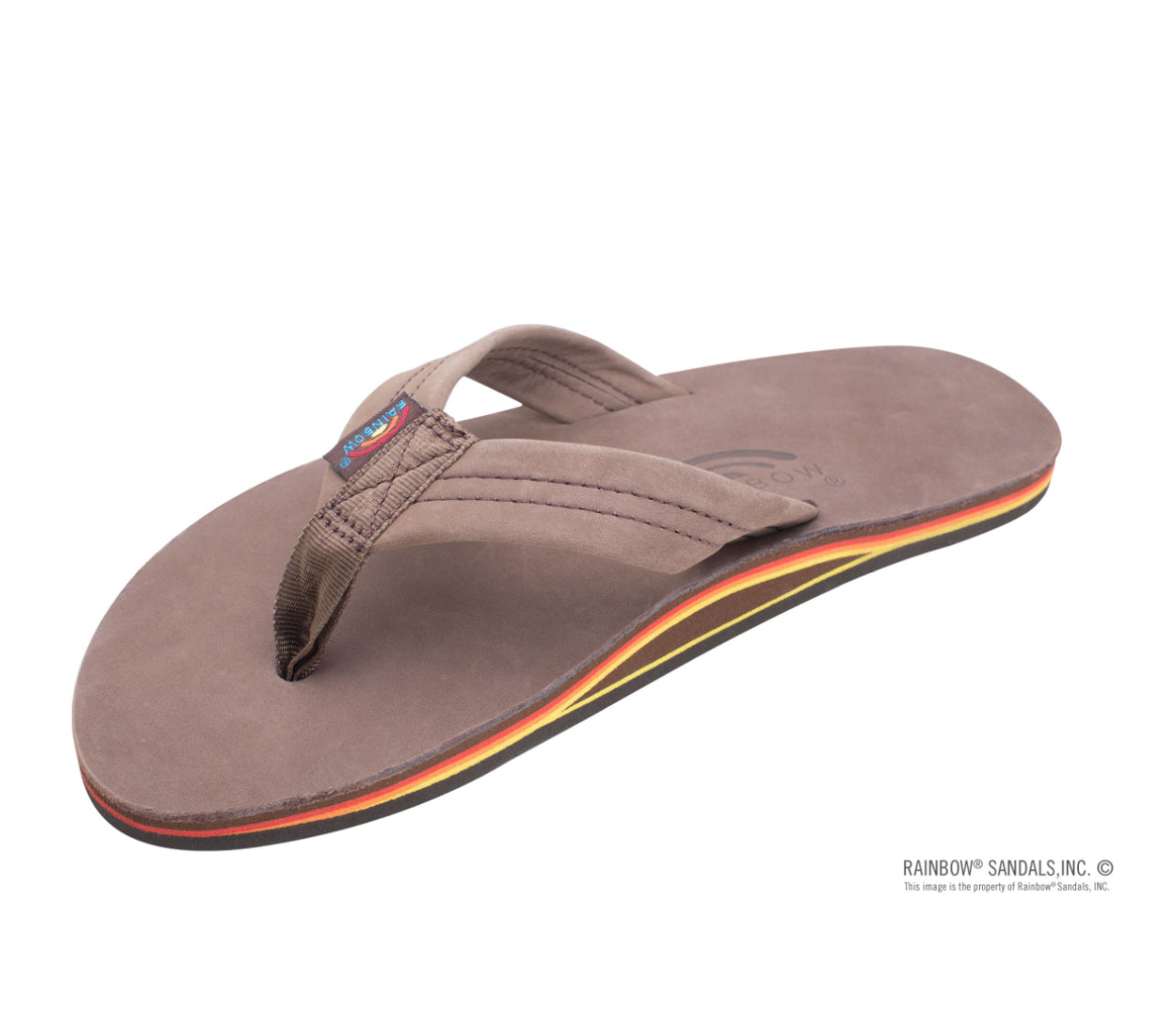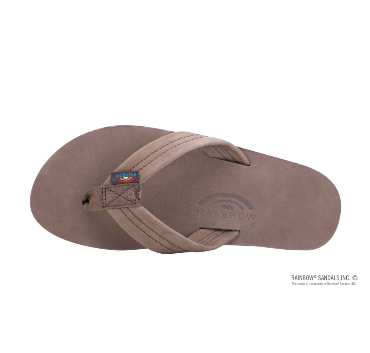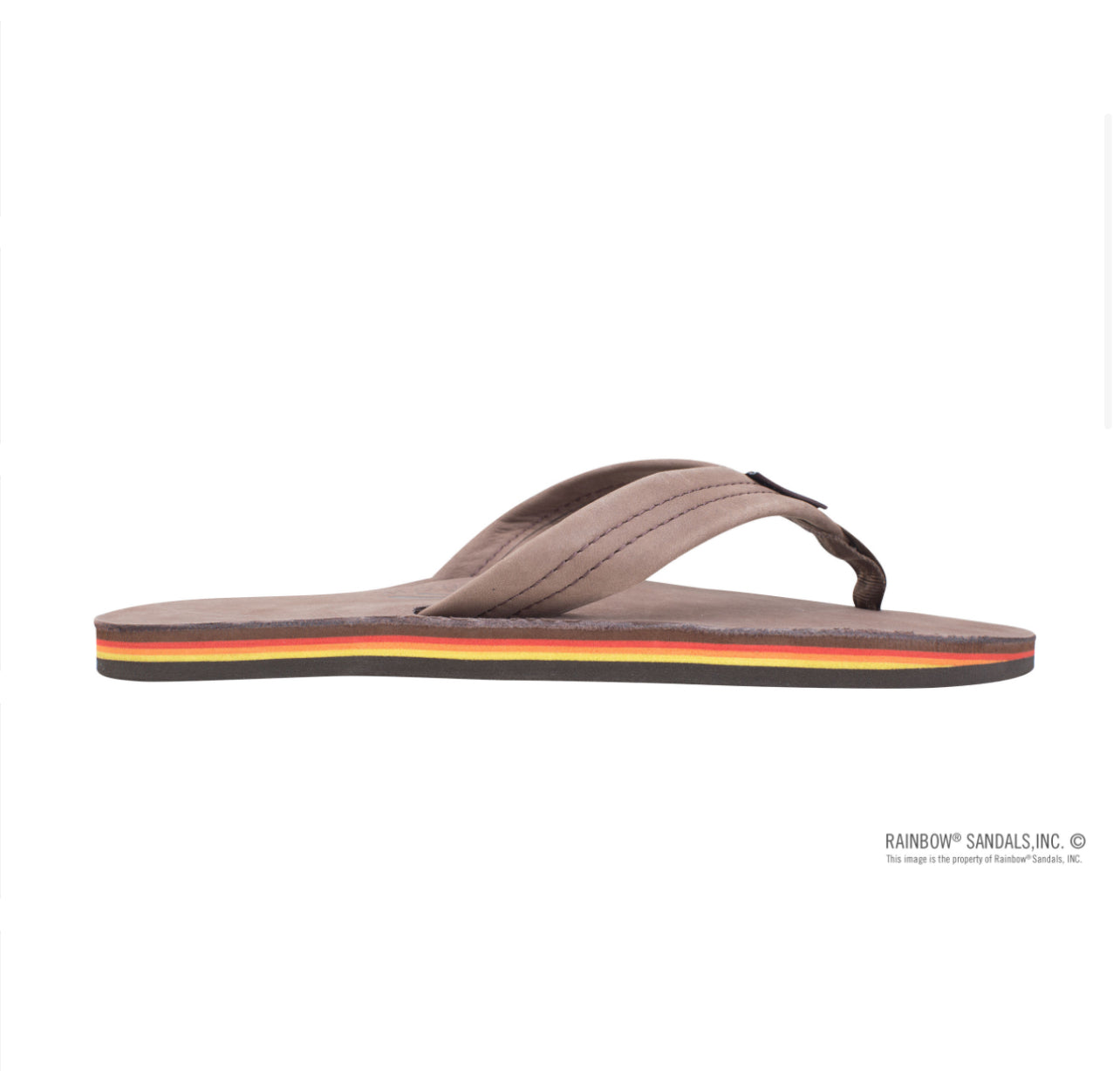 The single layer premier leather sandal is made with top grade nubuck leather; the top sole is embossed with the Rainbow® logo. The strap, also nubuck leather; is double stitched, and the nylon toe piece is secured with a box X stitch, all using bonded nylon thread.